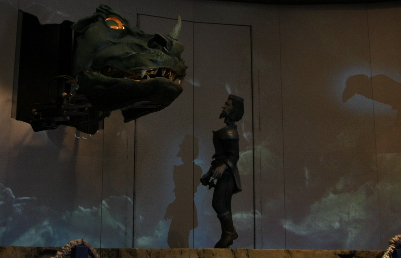 Postanowiliśmy też odwiedzić dziecięcy kącik (jakże by nie) – po drodze „zaliczyliśmy” wagę więc jeszcze chwilę spędziliśmy przeliczając wagi dziewczynek z dawnych miar krakowskich na współczesne kilogramy. Pewnie tej chwili brakło nam żeby zdążyć na początek przedstawienia o Królu Kraku które właśnie odbywało się w pokoju dla dzieci. Ten w pełni zmechanizowany spektakl zgromadził już kilkoro widzów i my z chęcią do nich dołączyliśmy. Teatr to lalkowy – zmechanizowany, zapewne skomputeryzowany – narratorem przedstawienia jest ruchomy kruk siedzący na żerdzi z boku sceny. Król Krak to pojawia się jako mała figura na wyłaniającym się z nicości pod sceną wzgórzu wawelskim – to znowuż jako większa postać wyrusza do walki ze smokiem wyłaniającym się z jamy w tylnej ścianie sceny (tutaj Tosia zatkała uszy i przezornie usunęła się na bok – bo a nuż smok zechce zionąć ogniem). Animacja prosta, uzupełniona obrazami z rzutnika, narracją i muzyką – bardzo przyjemne było to przedstawienie.