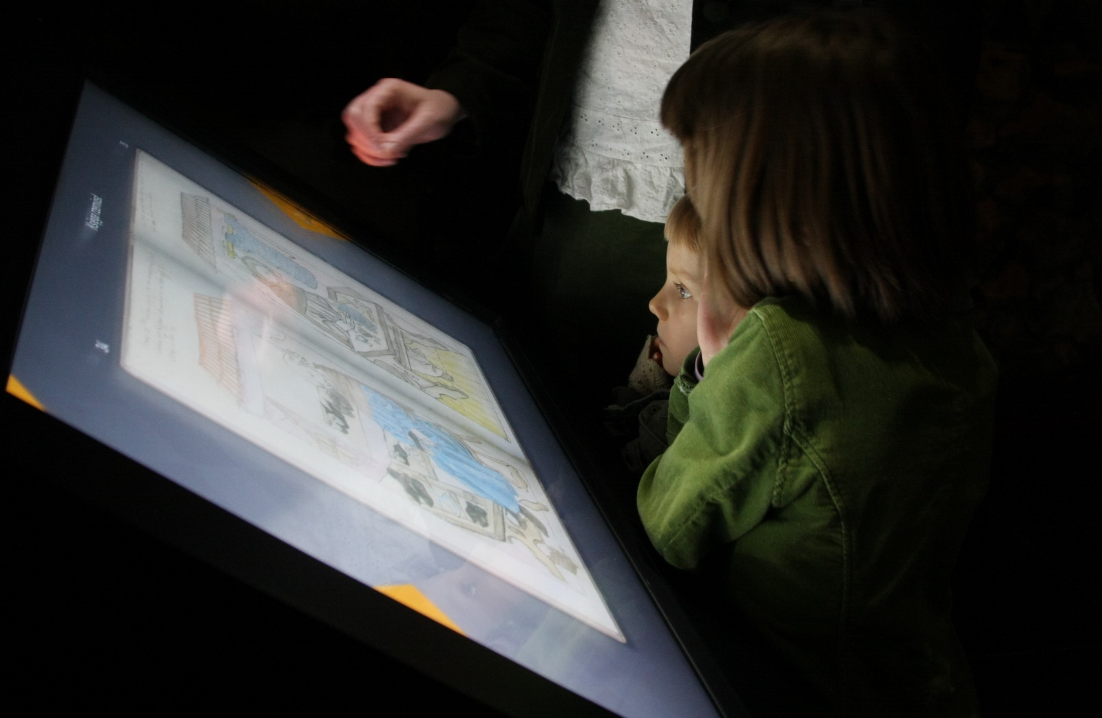 Nie staraliśmy się spędzać specjalnie dużo czasu przy kolejnych stanowiskach – pozwalając żeby zainteresowanie dzieci wskazywało kiedy idziemy dalej a kiedy zostajemy i oglądamy. Zainteresowanie wzbudziły mapy – jedna duża pod podłogą z szyb – można po niej pospacerować i przyglądnąć się szlakom Krakowskich kupców – druga natomiast wyświetlana na dużym ekranie – ta wyglądająca trochę bardziej średniowiecznie (z wizerunkami płynących statków i poruszającym się smokiem na odległych południowo-wschodnich rubieżach). Spędziliśmy trochę czasu przy chatce z rekonstrukcją warsztatu metalurgicznego – dziewczyny wprawdzie miały możliwość obejrzenia pracy kowali w czasie ostatnich wakacji – ale tutaj to nie do końca kowalstwo – na filmie pokazane było odlewanie klamer i pierścionków, a pierścionki to już coś bardziej interesującego niż metalowe elementy wyposażenia średniowiecznego woja. Tosia utknęła na dłuższą chwilę przy płonącej osadzie – panoramiczny film w rzeczywistej skali robi faktycznie duże wrażenie.